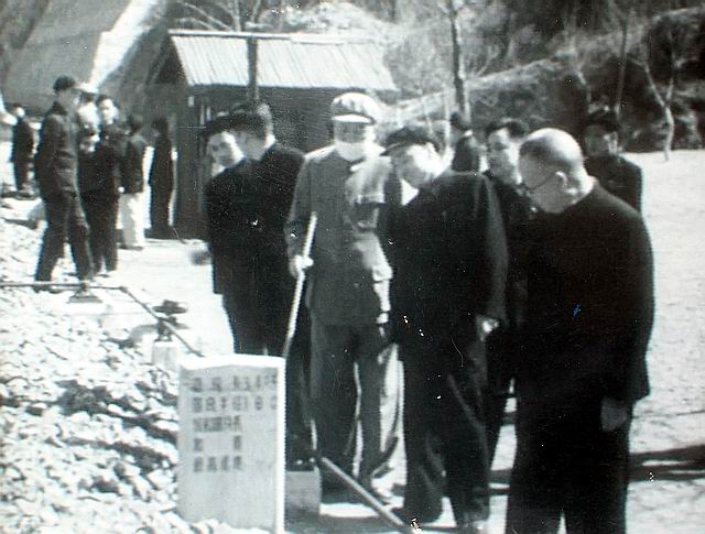 图二,1953年,毛泽东在青龙桥车站观看180曲率牌,陪同人员杨尚昆、程潜、刘思齐、孙勇、徐肖冰,侯波