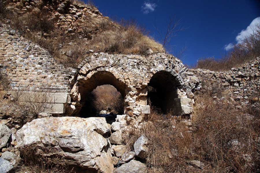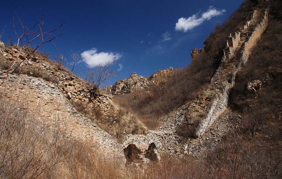 3、长城沿涵洞两边陡峭的山崖攀上山顶,过去只认为司马台长城独有的障墙结构,在这里又能见到啦。