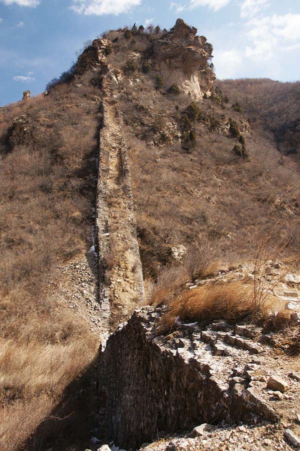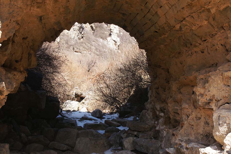 只要不离开这条小溪,就能沿溪边小径到达五道梁水关,路程不足十里。不幸的是我错误的左拐沿一条砍柴道,结果不得不爬上一个刀背山脊,向西沿一道很陡的碎石干壘的长城下到沟底,才又走上去五道梁关的小路,这几乎浪费了我近两个小时的时间。