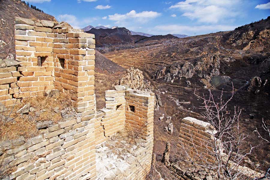 1、西侧的长城障墙只有部分坍塌,残留的障墙依然顽强的挺立荒山峡谷之中。