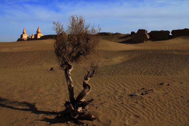 傲立:01年西北军到额济那黑城,拍到一棵顽强独立的胡杨,记得是趴在沙地上拍的,别说,在网上查了一下黑城的照片,这个角度的片子不少,不过都没有胡杨,所以就那这张有胡杨的来充数。
