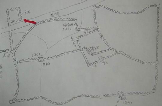 我的草图在此有两处不准:一处是该城似乎应该是东西略长的长方形;二是图的西北角应将墙继续向北延伸,此道墙直通到蔡家峪。