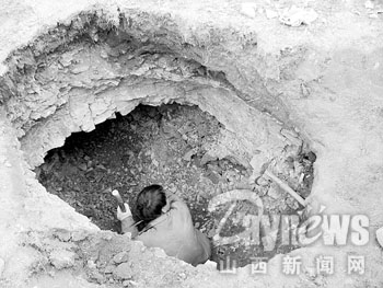 沿着长城往东走,不时见到长城被道路斩断和铲开长城搭建临时房屋的情形。又往前走了约3公里,看到几个村民打扮的人手持铁锹、铁叉,正低着头在荒野中专注地搜寻着什么。见了记者,他们多少有些惊慌。记者急忙自我介绍是来考察长城的,他们才解除了戒备之心。这五六个人分成两拨儿,已掘出两个一米见方的深坑,两个中年人正在坑下挖,一边挖一边往上扔褐色小石块。