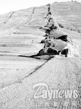 随后,记者来到利民堡村,在村东与由北边山上蜿蜒而下的长城相遇。记者在通往村里的柏油路北侧看到,这里的长城与记者在大同看到的外长城相比,高度、宽度毫不比前者逊色。而到了柏油路的南边,长城的“体形”就变得忽高忽低,忽胖忽瘦,其残破之状让人痛心:这里的农民竟然“别出心裁”地把长城宽大的墙基挖开,平整成一条宽两米左右的狭长田地。田里庄稼已收割,翻过的地垄里,偶尔可见遗留的几个土豆。
