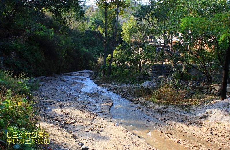 从十号台上下撤,来不及吃饭,即匆匆赶往下一目标——茨字六号台。这需要返回史家寨乡,北去段庄,全程约50公里,全是乡间路。路途上意外频发,先是在仅容一车通过的水泥路上遇到对方货车载货超宽,卡到路边大树上动弹不得。这个事件的处理耽误了所有车辆一个小时。等货车能开动了,我方所有汽车不得不倒车1公里,给对方让出路来。唯一补偿是在等候过程中我抓紧睡了一觉,下午有精神开车。随后又遇到史家寨到段庄的泥浆坑洼路。下午15时赶到七里沟村口,照例寻访老乡,老乡们发表了不同意见。有说路远着哩,走不到;也有说越野车可以开到“炮楼”下,当天上午还有一辆车开进去。七里沟溪很是特殊,既不是水泥路,更不是柏油路,但也不是土路。上游地层含沙丰富,经过河水不断冲刷形成一条沙质路。经过权衡我决定步行进山,人员进山即使遇到意外还可以退出来。而如果单车进山,万一陷车在深山中后果难想。