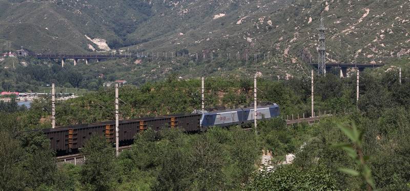 图七:大秦铁路是运煤专线,运输繁忙,几分钟就是一列。照片上是两列对开的2万吨重联列车。煤运得多说明经济发展,不过煤资源是几亿年中形成的,中国的工业化不过百十年,现在能源浪费极大,把子孙后代的吃光了。