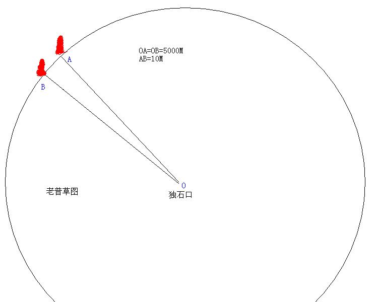经过在卫星地图上测量,连墩到独石口堡西墙的直线距离4719M,到独石口十字中心街口距离5053米,圆半径OA取5000米。当分辨率取1角分,即1/60度,代入计算式,则