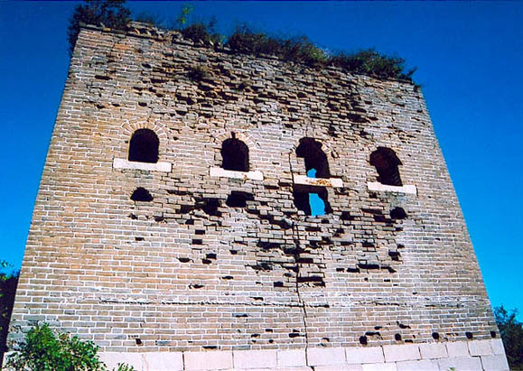 我的长城 走遍万里关山,矢志此生无悔 2004-01-20 Tue程山长城---“人马平安”门拱被遗弃在楼东门附近草地上。 程山长城---山顶“天下太平”楼《明长城考实》:程山山顶有一座较好的敌楼,楼东侧墙有门,居两箭窗南,券拱石门,框上有竖式镌刻的“人马平安”四个字;南侧墙有一门,居两箭窗中,券拱石门,框上亦有竖式镌刻“天下太平”四字。东门的字较南门的清楚。 程山长城---残缺的雕花怀疑可能是箭孔的雕花,从右下角的自然斜面判断。 2004-01-11 Sun界岭口西长城---“中部八作霍虎造”这应该是修建长城的士兵的留名,曾见“万历二十一年德州营右部作头李学忠造”的文字砖记载就在界岭口。 界岭口西长城---“X营秋防造”文字砖按《青龙文史资料》第四辑载:界岭口有两类文字砖 界岭口西长城---箭孔雕花界岭口西的长城几乎见不到一个垛口,何况雕花箭孔。 界岭口西长城---“左X砖”此砖应该出于砖窑,请论证! 界岭口西长城---“万历陆年宣府营造”文字砖楼砖就是在这楼上发现的,楼却只有这面墙还见得人了!