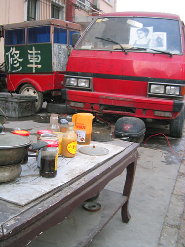 2004-02-18 Wed 拿图片纪录生活--俺们小区的修车师傅 2 这是前天路过时随手拍下的,因为突然发现修车师傅的摊子上有了些变化。什么变化,看官们自己对比吧。这是修车师傅的幸福生活?还是师傅向往的幸福生活?
